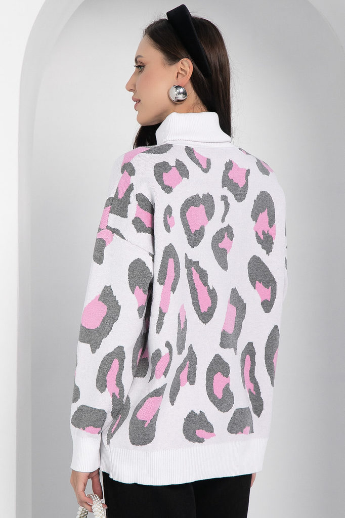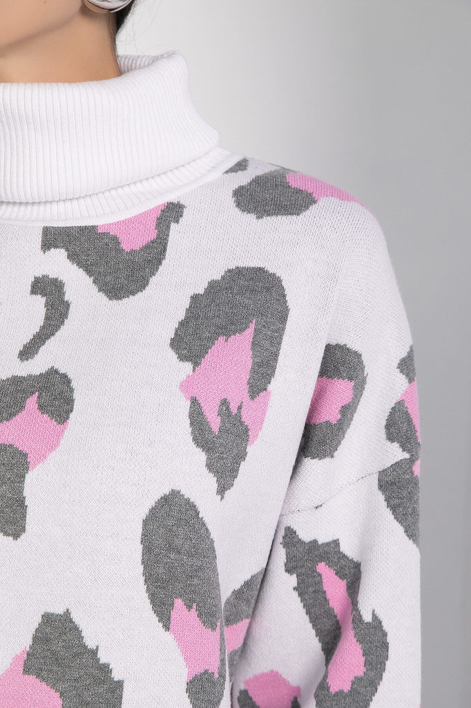 Артикул: Б12701-18. Тип ткани: смесовая. Состав: 70% хлопок, 20% кашемир, 10% спандекс. Материал: трикотаж. Цвет: бело-розовый. Принт: леопард. Вид застежки: без застёжки. Силуэт: прямой. Карманы: отсутствуют. Подкладка: отсутствует. Декоративные элементы: отсутствуют. Длина по спинке от верхней точки плеча: ONE SIZE (44-52) - 64 см. Рост модели: 168 см. Джемпер прямого кроя с длинными рукавами — воплощение комфорта и тепла. Он мягкий и приятный на ощупь, что делает его идеальным выбором для повседневной носки. Свободный крой и спущенная линия плеча создают ощущение простора и свободы движений. Вы будете чувствовать себя комфортно в любой ситуации. Высокий ворот-хомут не только добавляет стильный акцент, но и надёжно защищает от холода. Леопардовый принт придаёт дерзости и оригинальности. Наденьте этот джемпер и наслаждайтесь его уютом! Уход за изделием: ручная стирка до 30 градусов; нельзя отбеливать; отжим запрещён; гладить при t не более 110 С; гладить с изнанки. Внимание! Рекомендуем ориентироваться на размерную сетку и выбирать свой привычный размер, согласно размерной таблице. *Допуск отклонения длины при массовом производстве 1-3 см является нормой.
